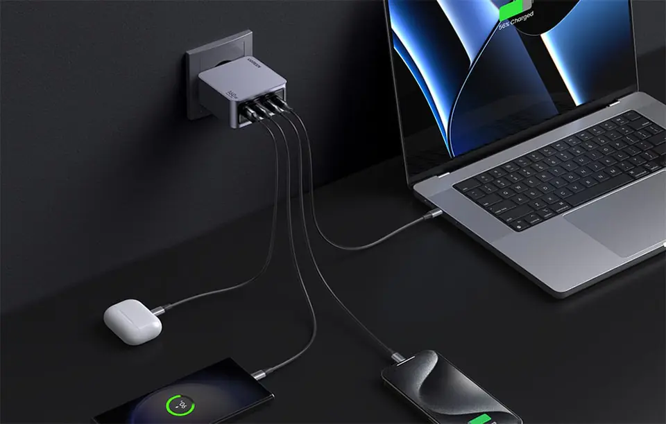 Nie trać cennego czasu na oczekiwanie, aż Twoje urządzenia się naładują. Ładowarka Ugreen oferuje port USB-A oraz trzy porty USB-C, co umożliwia podłączenie nawet czterech urządzeń jednocześnie. Dodatkowo obsługuje ona protokoły szybkiego ładowania, w tym PD3.1, QC4.0, PPS i AFC. Dzięki temu, Twój iPhone 15 może odzyskać 60% energii w zaledwie 30 minut, a Samsung S23 Ultra nawet 68% w takim samym czasie. Co więcej, MacBooka Pro 16 można naładować z mocą 140 W, wystarczy tylko zaopatrzyć się w odpowiedni kabel USB-C.