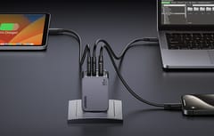 Z Ugreen nie musisz czekać, aż jedno urządzenie będzie naładowane, zanim podłączysz kolejne. Ładowarka Nexode Pro oddaje do Twojej dyspozycji 3 porty – 2x USB-C i 1x USB-A. Dzięki temu możesz ładować nawet 3 sprzęty w tym samym czasie! Dodatkowym atutem produktu jest szeroka kompatybilność. Za jego pomocą bez problemu naładujesz większość popularnych urządzeń, takich jak na przykład smartfony, drony, przenośne konsole do gier, tablety czy słuchawki bezprzewodowe.