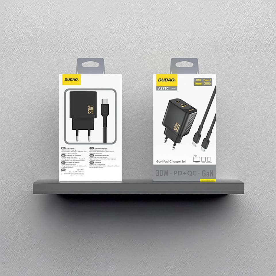 Kod produktu: 1032285Ładowarka sieciowa Dudao A27TCEU to nowoczesne i kompaktowe rozwiązanie do szybkiego ładowania urządzeń mobilnych w domu, biurze i w podróży. Technologia GaN w połączeniu z mocą do 30 W umożliwia wydajne ładowanie przy zachowaniu niewielkich rozmiarów obudowy. Dwa porty USB-A i USB-C pozwalają ładować dwa urządzenia jednocześnie, bez utraty stabilności pracy. Zastosowany 9-warstwowy system zabezpieczeń wspiera bezpieczne użytkowanie na co dzień. W zestawie znajduje się kabel USB-C - USB-C o długości 1 m, gotowy do użycia od razu po podłączeniu.Cechy produktu: