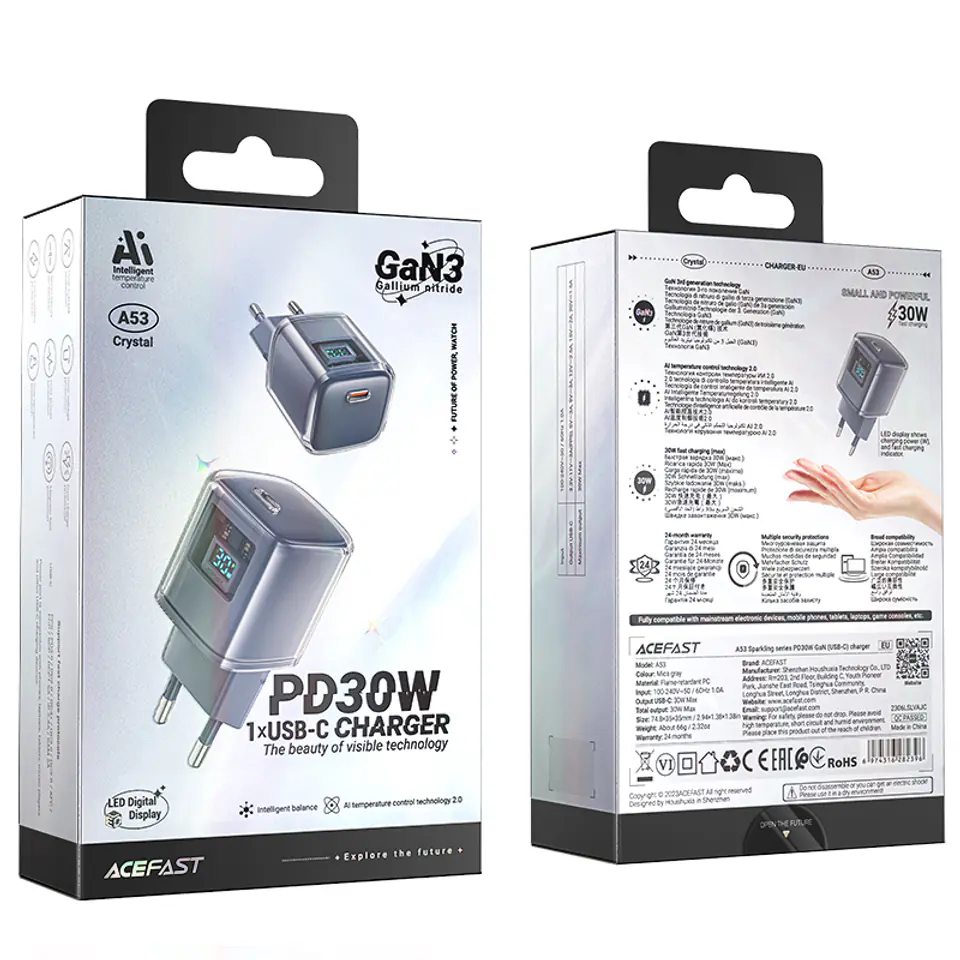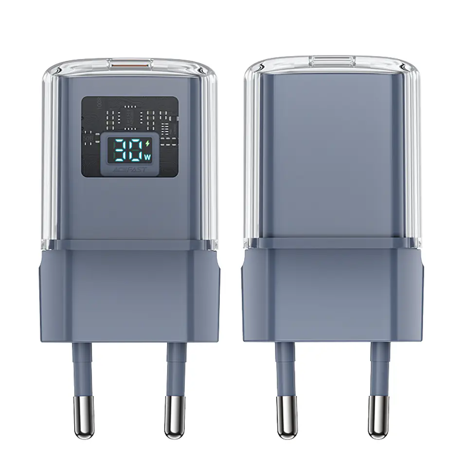 Kod produktu: 1024149Ładowarka Acefast A53 umożliwia ładowanie kompatybilnych urządzeń z mocą do 30 W. Przejrzysta obudowa ukazuje wewnętrzy chip i zachwyca intensywnym kolorem. Wyświetlacz LED pokazuje aktualną moc ładowania. Technologia GaN gwarantuje wydajne i stabilne ładowanie. Ładowarka dysponuje również funkcją inteligentnej kontroli temperatury, by nie doszło do przegrzania Twojego ulubionego urządzenia.Najważniejsze cechy: