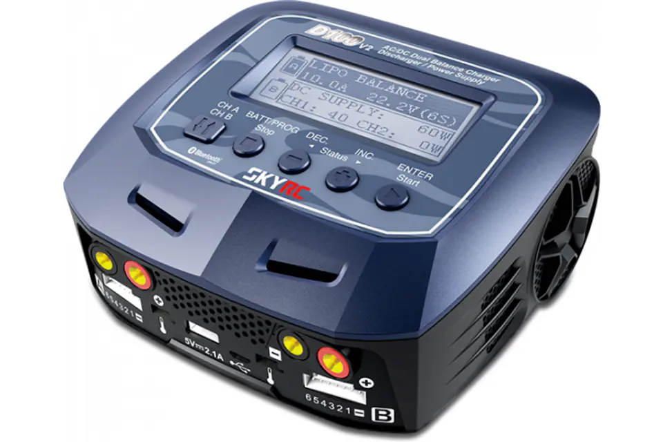 SkyRC D100 v2 to nowa wersja bardzo popularnej ładowarki D100. Jak swoja poprzedniczka jest to dwukanałowa ładowarka z dwoma niezależnymi obwodami, dzięki którym można ładować dwa rodzaje akumulatorów jednocześnie. D100 v2 posiada teraz funkcję komunikatów głosowych w j. angielskim, które pozwala z łatwością na konfigurację ładowarki . Ładowarki można używać jako miernika baterii litowej i miernika rezystancji. Istnieje także automatyczne ograniczenie prądowe, temperatury i limit czasu przetwarzania, wszystkie te funkcje sprawiają że ładowarka jest bardzo bezpieczna.