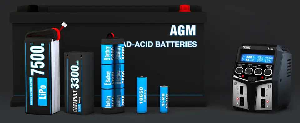 Ładowarka SkyRC T100 to dwukanałowa ładowarka, która jest w stanie naładować lub rozładować wszystkie najpopularniejsze typy akumulatorów. Przemyślana konstrukcja pozwala na bezproblemowe podłączenie do portów balansera i wtyczki XT60. Ładowarka jest niewielka, ale posiada aż 100 watów mocy, które pozwalają na ładowanie akumulatora prądem 5 amperów. Ładowarka posada również tryby ładowania AGM i zimny do ładowania akumulatorów kwasowo-ołowiowych i AGM w niższych temperaturach.