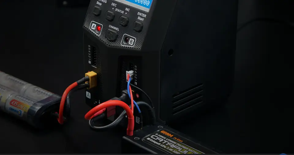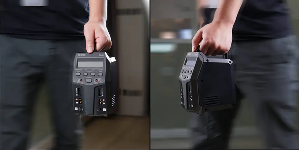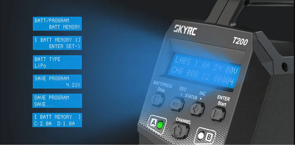 Ładowarka SkyRC T200 posiada najbardziej kompaktowa konstrukcję, zajmując minimalną ilość miejsca, tyko tyle co para akumulatorów. Ładowarka dostarcza 100 watów zintegrowanej mocy przez każdy z obwodów ładowania. Za gustowną obudową znajduje się wystarczająca moc, by ładować jednocześnie dwa akumulatory z natężeniem do 12 amperów na kanał, dzięki czemu błyskawicznie wpompujesz życie do szerokiego zakresu akumulatorów, od pakietów odbiornika po litowo-polimerowe akumulatory 6S lub NiMH i NiCD 15S. Co więcej, ładowarka zapewnia pełną programowalność, której oczekuje się od nowoczesnej ładowarki wysokiej klasy.
