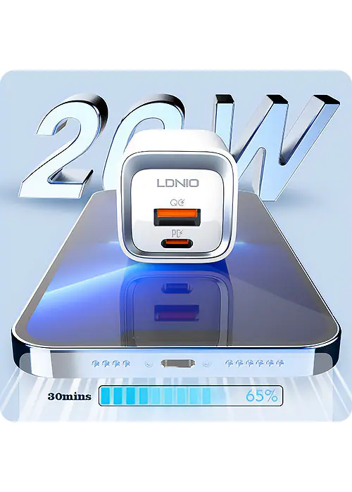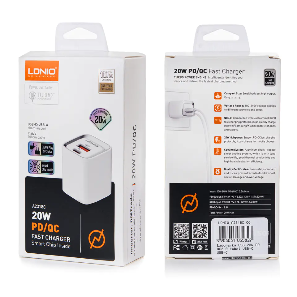 Ładowarka sieciowa USB-C i USB PD QC3.0 20W + kabel USB-C LightingLDNIO A2318C to urządzenie, które umożliwia szybkie i wygodne ładowanie akumulatorów w urządzeniach przenośnych takich jak smartfony, tablety czy też inne gadżety. Ładowarka jest wyposażona w port USB-C oraz dodatkowy port USB-A, dzięki czemu można je podłączyć do większości popularnych urządzeń. Ładowarka posiada również funkcję Quick Charge 3.0, co oznacza, że urządzenie jest w stanie szybko i efektywnie naładować akumulatory o dużej pojemności. W zestawie jest także kabel USB-C na lighting o długości 1m.