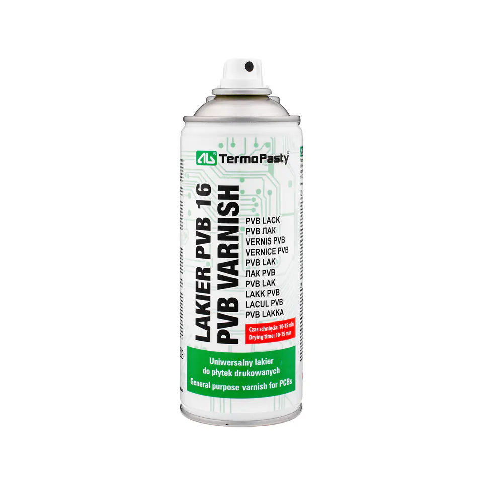 Szybkoschnąca przezroczysta powłoka PVB o dobrych właściwościach izolacyjnych. Zabezpiecza przed korozją płytki drukowane i inne elementy pracujące w niesprzyjających warunkach atmosferycznych. Powłoka chroni płytki drukowane przed powstawaniem prądów błądzących i zwarć. WŁAŚCIWOŚCI: Tworzy zabezpieczającą i izolującą warstwę chroniącą przed wpływami atmosferycznymi takimi jak: wilgoć, utlenianie, pyły, zanieczyszczenia chemiczne; Dobrze przylega do powierzchni metalowych, plastikowych i drewna; Tworzy powłokę odporną na rozcieńczone kwasy, alkalia i czynniki atmosferyczne; Możliwe jest lutowanie przez warstwę lakieru; Zapobiega iskrzeniu i wyładowaniom koronowym; Ogranicza przebicia miedzy ścieżkami; Nie zmienia przejrzystości i elastyczności nawet po długim czasie;