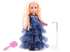 Elegancka lalka diwa operowa. Lalka z długimi blond włosami, w przepięknej balowej sukni, czarnych pantofelkach. Lalka w całości wykonana została z tworzywa sztucznego ma ruchome ręce, nogi, głowę. Piękna Ariana ubrana w granatową suknię balową, którą ozdabiają srebrne gwiazdki, może być najlepszą przyjaciółką dziecka. Oczywiście, że z taką lalką można iść na każdy bal, przyjęcie urodzinowe, ale przypuszczam, że Ariana też chętnie obejrzy bajkę, posłucha muzyki, zwierzeń itp. Przebywanie, zabawa z taką lalką to czysta przyjemność.Specyfikacja- wzrost ok. 45 cmZestaw zawiera:- lalka- stojak- szczotka do włosów