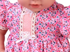Lalka ubrana jest w przepiękną różową sukienkę ozdobioną drobnymi fioletowymi i różowymi kwiatuszkami. Stylizację uzupełnia kilkuwarstwowa koronkowa opaska z kokardą w tym samym wzorze, wzbogaconą o subtelne detale - koronkowe wstawki i haftowane motywy kwiatowe. Do kompletu dołączone są miękkie, białe skarpetki oraz białe spodenki, które dopełniają całość i nadają lalce wyjątkowego uroku.