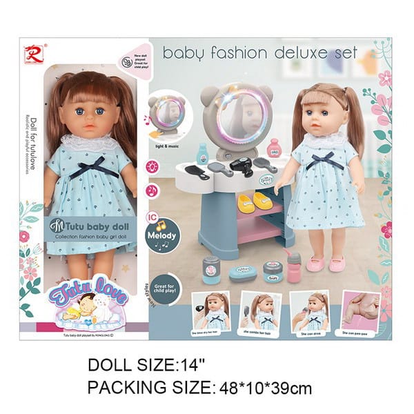 | Wymiary | - toaletka ok. 38,5 cm x 34,5 cm x 14,5 cm, - lalka ok. 35 cm x 16 cm x 10 cm, - pojemniczek do pojenia lali ok. 10 cm x 5 cm x 4 cm, - mydelniczka ok. 7,5 cm x 5 cm x 3 cm, - pudełko na maść ok. 4 cm x 4,5 cm, - pudełko na zasypkę ok. 7 cm x 4,5 cm, - pantofelki na zmianę ok. 5 cm x 2 cm x 3,5 cm - suszarka do włosów ok. 9 cm x 7,5 cm x 4,5 cm, - lusterko, ok. 11 cm x 5,5 cm x 2 cm, - grzebyk ok. 11 cm x 4,5 cm, - szczotka do włosów ok. 11 cm x 5,5 cm x 2 cm, - opakowanie ok. 48,5 cm x 39,5 cm x 10 cm. |