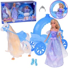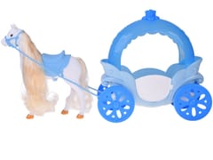 Biały koń z jasną grzywą i ogonem został wyposażony w ozdobne siodło oraz uzdę w błękitnym kolorze, pasującym do karocy. Pojazd księżniczki to okazała, bogato zdobiona karoca w iście królewskim stylu, idealna na bajkowe podróże po magicznym królestwie, odwiedziny u królewskich przyjaciół, czy dam dworu.