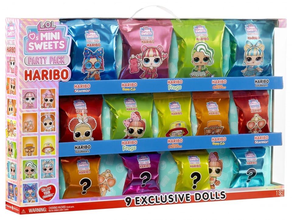 Lalka LOL Surprise Loves Mini Sweets X HARIBO Zestaw ImprezowyNajsłodsze maluchy w okolicy powracają! Przedstawiamy 3. serię LOL Surprise Loves Mini Sweets!LOL Surprise nawiązała współpracę z kultowymi markami, takimi jak Junior Mints, Tootsie, Tootsie Pop, Hersheys Bubble Yum, Dots, Haribo Goldbears, Haribo Frogs, Haribo Twin Snakes i Haribo Happy Cherries, aby dostarczyć Ci lalki inspirowane Twoimi ulubionymi słodyczami! Każda lalka ma niepowtarzalny styl, który jest smaczniejszy niż kiedykolwiek i pasuje do każdego smakołyku.