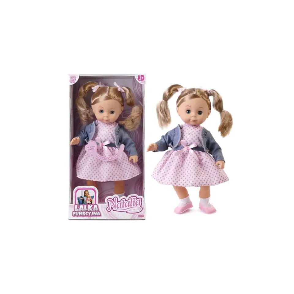 LALKA NATALIA MÓWI PO POLSKU Naciśnij mój brzuszek i posłuchaj co powiem! W zestawie: - lalka miękka 39 cm. Funkcje: - mówi po polsku: * cześć jestem Natalia * pobawmy się * chodźmy razem na spacer * lubię jak się ze mną bawisz - zamyka oczy Wymiary opakowania: 23 x 43 x 12 cm Baterie: lr44/ag13 x 3 załączone demonstracyjne Wiek: 3+