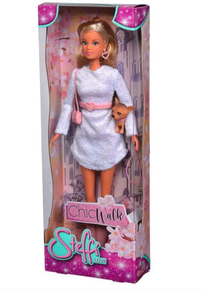 Lalka Steffi w olśniewającej stylizacji zawsze zgodną z obecnie panującymi trendami i odpowiednią do okoliczności, w jakiej się znajduje. Tym razem Steffi do oryginalnej sukienki z długimi rękawami i z błyszczącymi drobinkami ma dopasowane dodatki, jak pasek z klamerką w kształcie serca oraz duże kolczyki w kształcie serca, co podkreśla oryginalność stylizacji. Dodatkowo animuszu stylizacji dodają torebka i kozaczki. Lalce towarzyszy uroczy piesek chihuahua, którego prowadzi na smyczy.