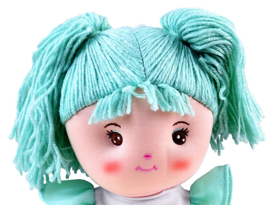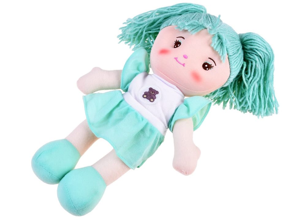 Urocza, mięciutka lalka szmaciana jest to klasyka zabawek. Lalka w tej wersji jest prawie od zawsze wśród dzieci, popularnie nazywana Zuzia jest idealna do przytulania, wysłuchiwania trosk, opowieści, chętnie pójdzie na pierwszą wizytę do lekarza, do przedszkola itp. Lalka uszyta jest z miłego w dotyku materiału, na buzi ma wyszyte brązowe oczka, różowy nosek i uśmiech. Włosy, sukienka, butki są w odcieniach mięty. Mięciutka, milutka w sam raz do przytulania.