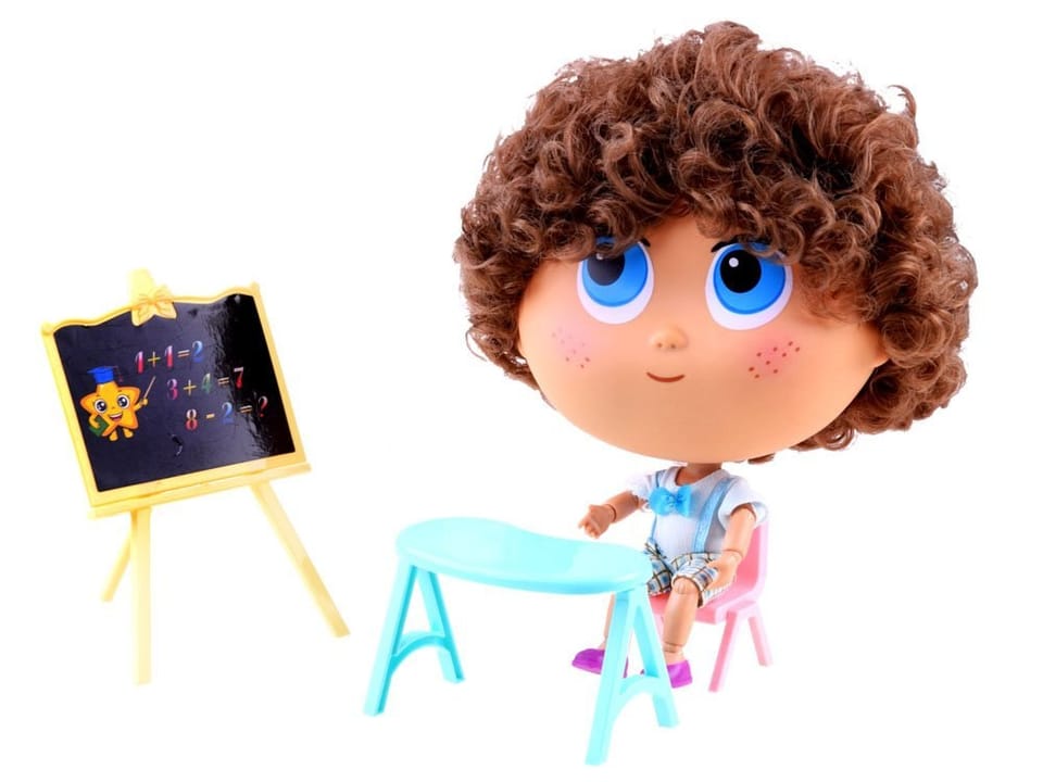 Totalnie oryginalna lalka uczeń Tymek do zabawy w szkołę zapewni mnóstwo wesołej zabawy każdemu dziecku. Zabawka w całości wykonana została z tworzywa sztucznego z mega kudłatą, zarośniętą włosami głową, wielkimi niebieskimi oczami, fantastycznymi piegami na policzkach i uśmiechem zapewne skradnie serca wszystkim. Lalka Tymek ma na sobie niebieską koszulkę z muszką, spodenki w kratę na szelkach i butki. Każda kończyna lalki zgina się w każdych możliwych stawach, a głowa robi obrót o 360 stopni! Także nie ma szans aby Tymek coś przeoczył, czy nie zauważył : ). Zestaw został wyposażony w tablicę, biurko i krzesełko.