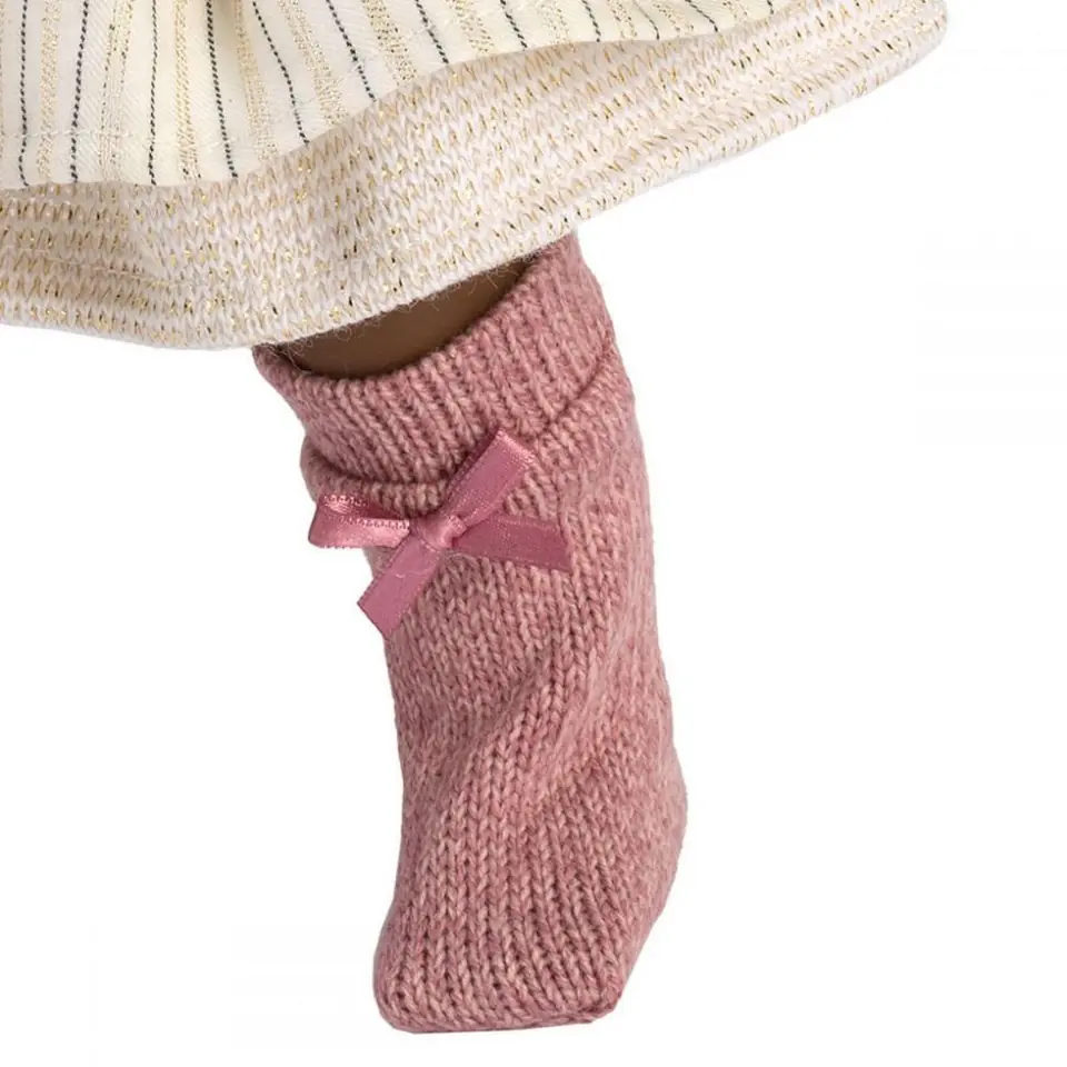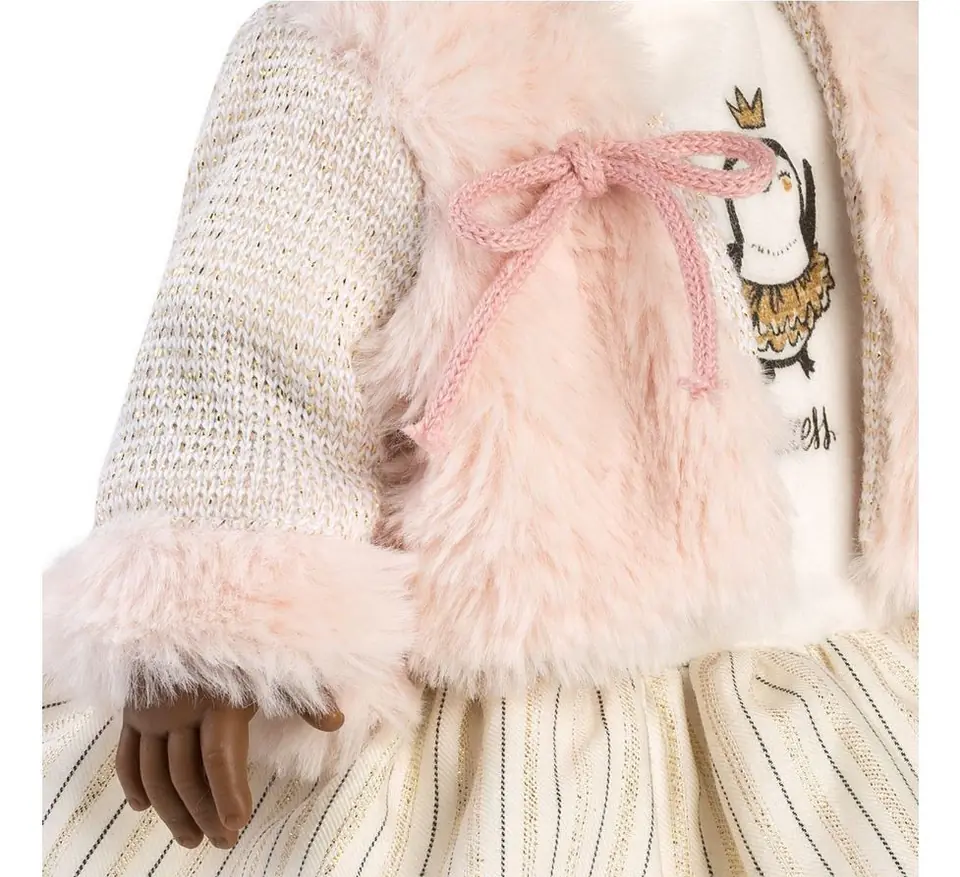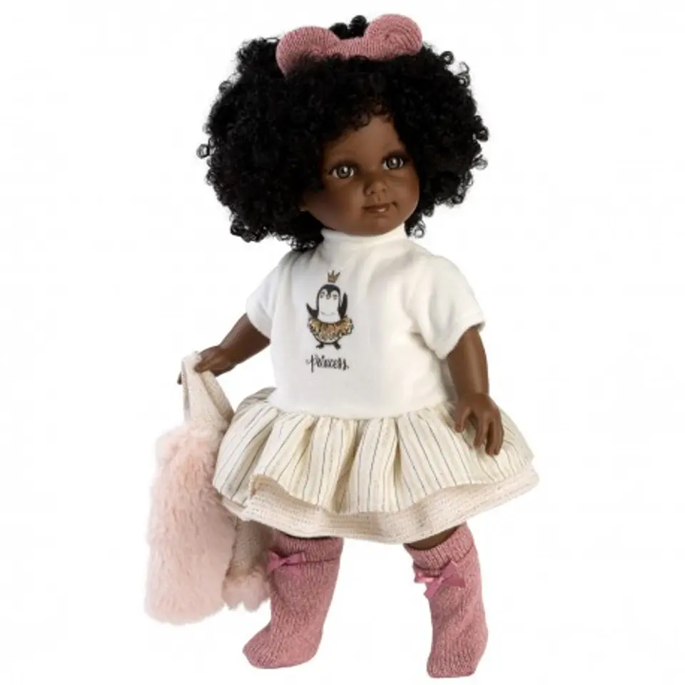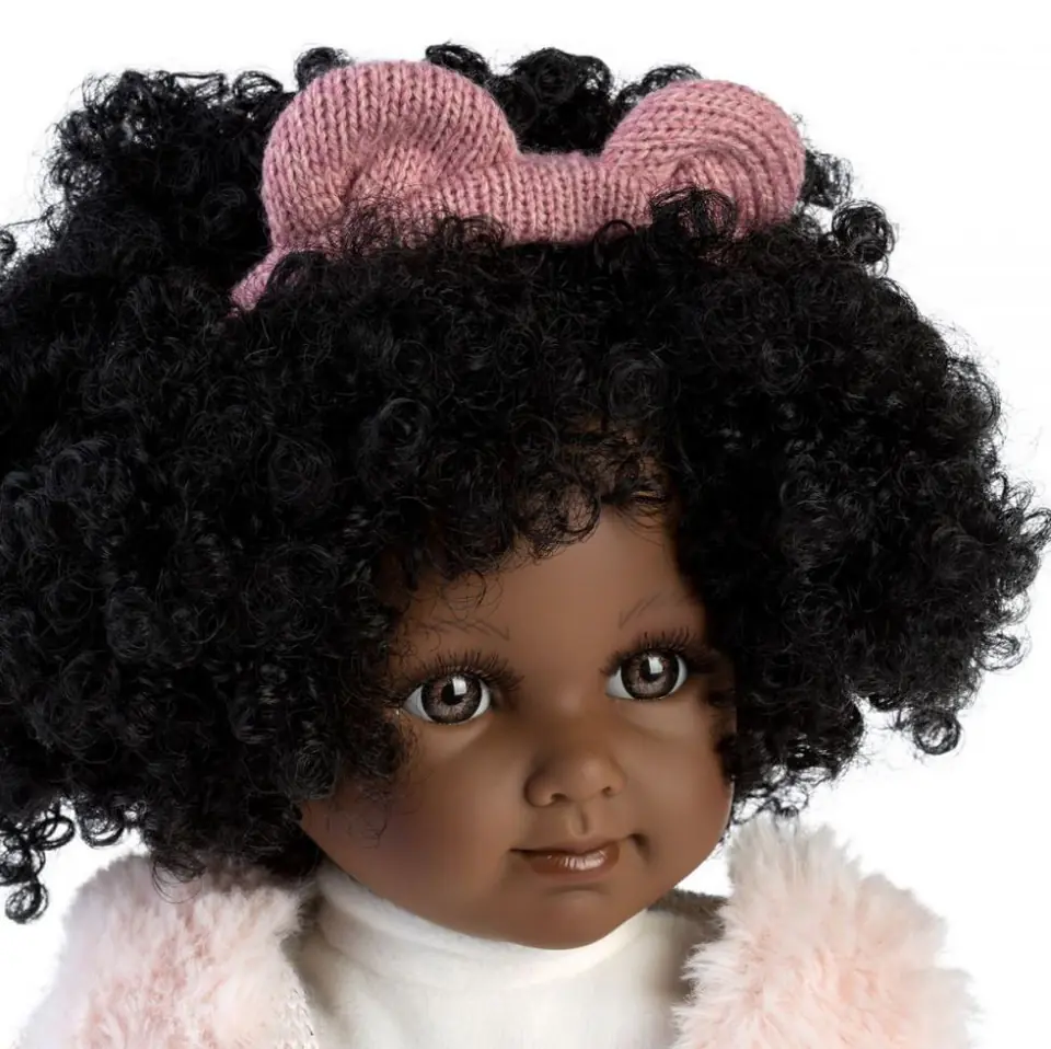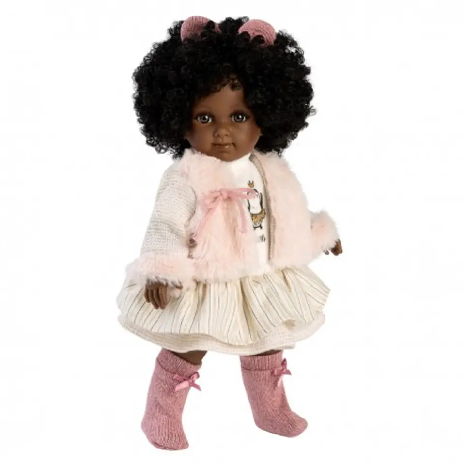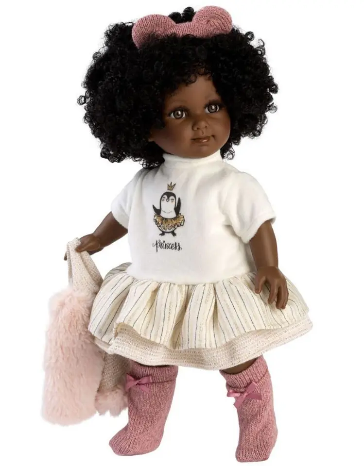 W naszej manufakturze wierzymy, że zabawa jest najlepszą nauką. Dlatego też z wielką miłością tworzymy kultowe lalki Llorens, w 100% ręcznie wykonane, o niepowtarzalnych wzorach. Stosowane przez nas tkaniny pochodzą od renomowanych marek odzieży dziecięcej. Wszystkie lalki Llorens są zgodne z europejskimi przepisami dotyczącymi bezpieczeństwa dzieci, co gwarantuje, że Twoje dzieci będą się bawić w możliwie najbezpieczniejszy sposób. Lalka Zuri 35 cm jest to piękna ciemnoskóra dziewczynka, która posiada bujne, kręcone, czarne włosy i brązowe oczy. Cała stylizacja lalki jest bardzo modna i dziewczęca. Ubranka uszyto z przyjemnych w dotyku tkanin by zapewnić dziecku wysoki komfort zabawy. Zuri jest ubrana w sukienkę z łączonych materiałów, futrzana kurteczkę oraz długie skarpetki z kokardkami. Dopełnianiem stylizacji jest śliczna opaska. Jej rączki, nóżki i główka zostały wykonane z przyjemnego w dotyku winylu a brzuszek z materiału, wypełniony miękką wyściółką. Lalka została zapakowana w ozdobny karton. Kochamy hiszpańskie lalki Llorens!