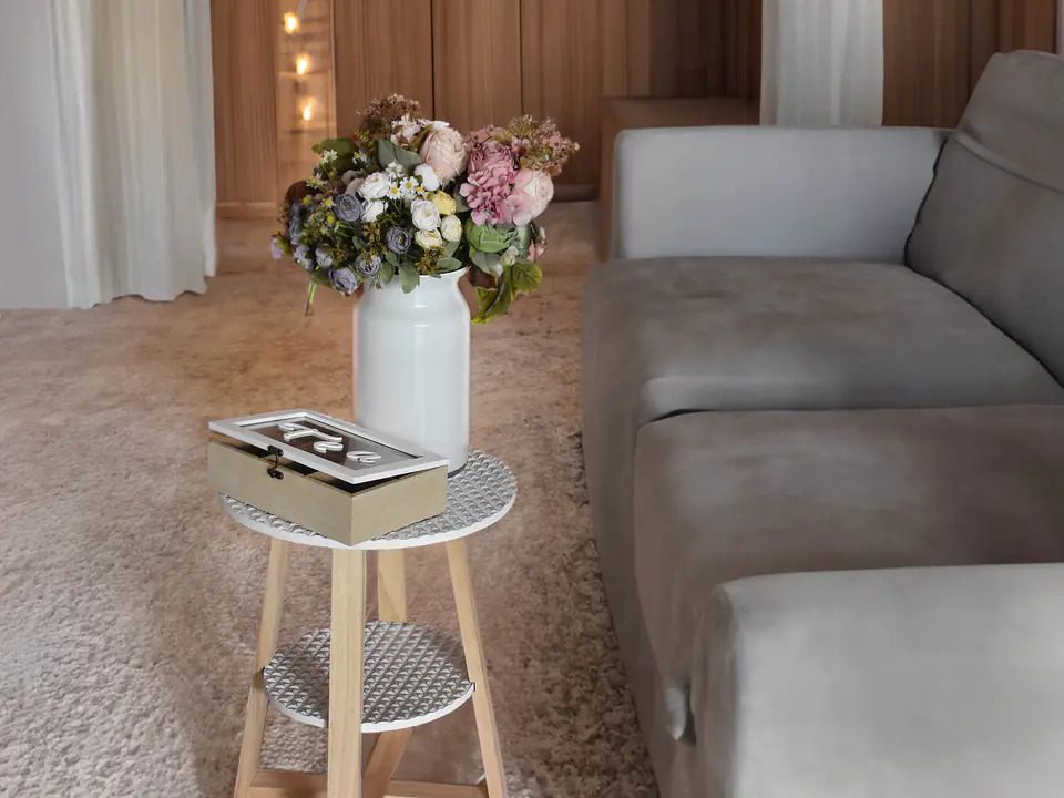 Stół LAMMY marki MONDEX to dwupoziomowy stół z płyty mdf, który wymaga samodzielnego montażu. Posiada unikatową fakturę blatu, która mimo nierówności zapewnia stabilne przechowywanie rzeczy na nim. Blat jest zdobiony przecieraną farbą aby uzyskać ten niepowtarzalny efekt. Ten stylowy i nowoczesny mebel jest idealny do każdej przestrzeni życiowej, dzięki eleganckim liniom i praktycznemu wzornictwu. Wykonany jest z wysokiej jakości materiałów, dzięki czemu jest mocny i trwały, mimo swojej lekkości. Materiał blatu jest odporny na zarysowania. Dwa poziomy umożliwiają wykorzystanie stolika LAMMY zarówno do przechowywania, jak i ekspozycji, dzięki czemu idealnie nadaje się do każdego pomieszczenia w domu. Dzięki prostemu, ale eleganckiemu wzornictwu, stolik LAMMY wniesie odrobinę wyrafinowania do każdego wnętrza.wymiary całości: 40xh50cmśrednica blatu wyższego: 40xh1cmśrednica blatu niższego: 30xh1cmdługość nóg: 48cmkolor dominujący: czarnyprzetarcia: złotewymaga somodzielnego złożenia, instrukcja załączona w opakowaniuzapakowany jednostkowo w brązowy karton o wymiarach: 40,5x8x52,5cmczyścić punktowo wilgotną ściereczką