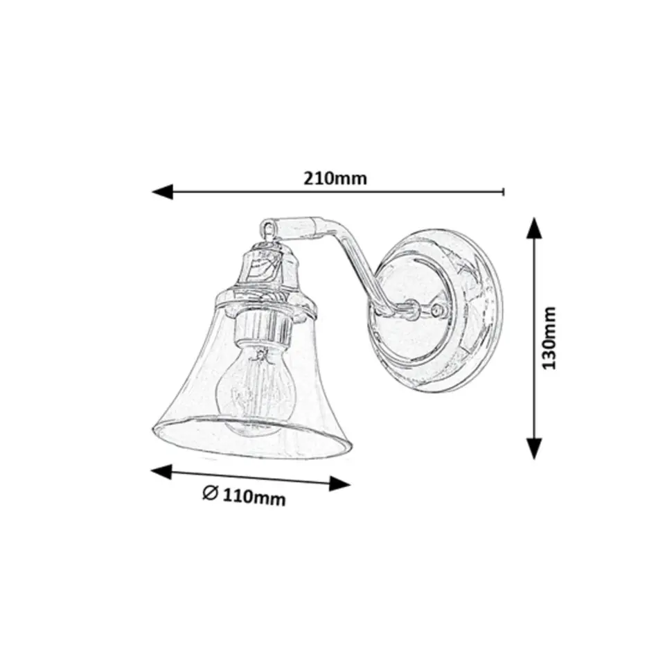 Cechy- Kinkiet łazienkowy Antoine w klasycznym stylu jest polecany osobom, które chcą wyposażyć łazienkę w eleganckie dodatki- Model ten można umieścić w pobliżu umywalki lub wanny, gdzie zapewni nastrojowe oświetlenie podczas wieczornych rytuałów przed snem- Metalową oprawę w kolorze chromu uzupełnia przezroczysty szklany klosz w kształcie dzwonu- Lampa Antoine może zostać przymocowana do ściany za pomocą okrągłej podstawy dekoracyjnej i potrzebuje jednej żarówki o mocy do 40W- Typ oprawki to E14- Wymiary tej łazienkowej lampy ściennej są następujące: szerokość 110 mm, wysokość 130 mm, odległość od ściany 210 mm