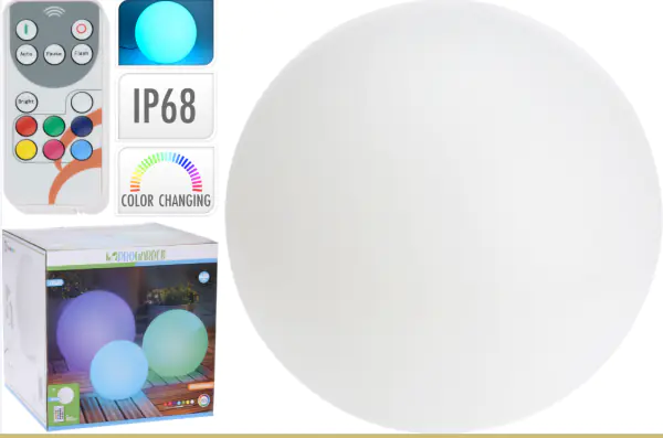 Lampa ogrodowa kula 30 cm multicolor Lampa kula nowoczesne i energooszczędne oświetlenie LED do Twojego ogrodu. Kulę wykonano z polietylenu, co przekłada się na stopień ochrony IP68i zapewnia jej odporność na wpływ czynników atmosferycznych i promieniowanie UV. Dołączony do produktu pilot do zdalnego sterowania pozwala zmieniać światło wedle uznania. Lampa ogrodowa doskonale prezentuje się o każdej porze roku: częściowo przysypana śniegiem, ułożona na miękkim zielonym trawniku czy podczas ciepłych letnich wieczorów w ogrodzie.Dane techniczne: Wymiary:30 cm, Kolor biały, Kolor światła: multicolor, Długość kabla: 1,8 m 4 TRYB ZMIANY KOLORU, 12 LED Pilot,