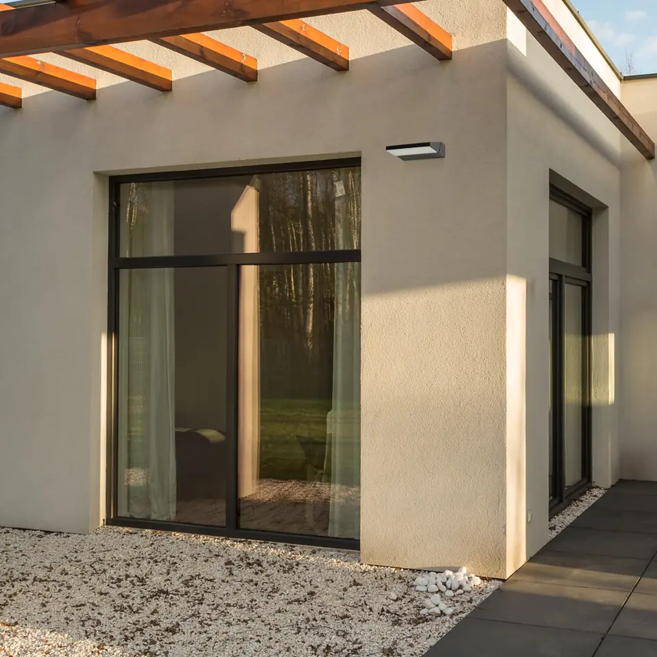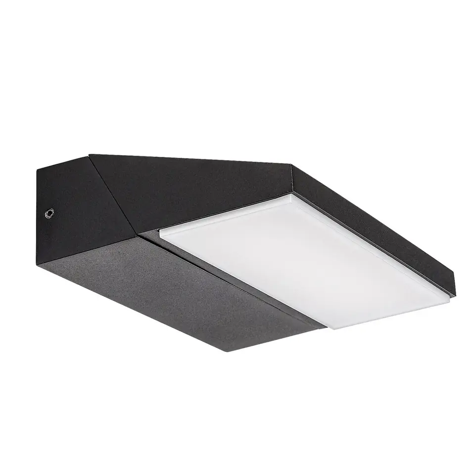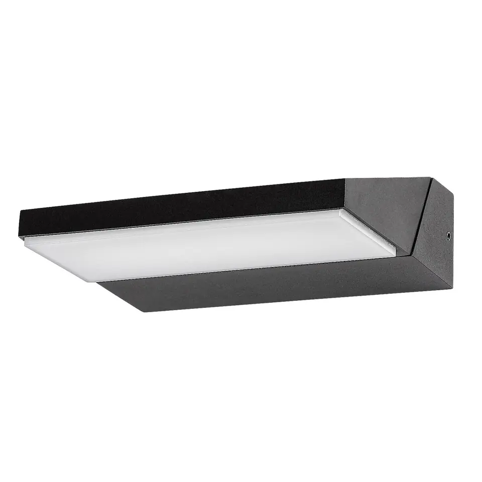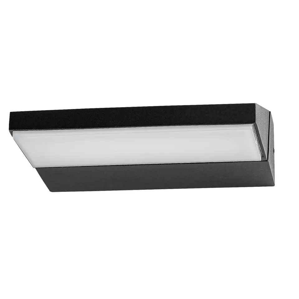 Zewnętrzna oprawa ścienna Senica polecana jest na taras lub zewnętrzną ścianę domu osobom szukającym prawdziwie nowoczesnej oprawy o prostych kształtach do zastosowania na zewnątrz.Wykonany z aluminium czarny model jest uzupełniony białym kloszem z tworzywa sztucznego, a głowica jest skierowana w dół, co czyni oprawę dobrym wyborem do zastosowania na przykład nad drzwiami wejściowymi.