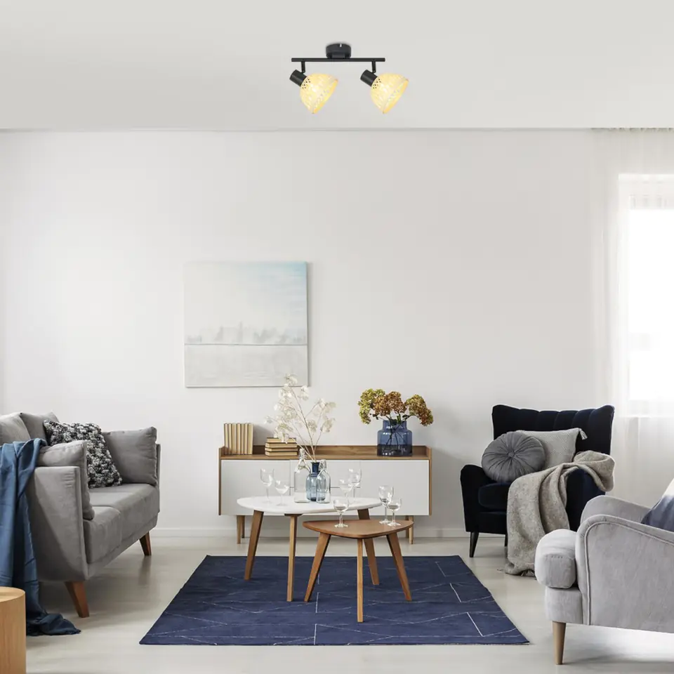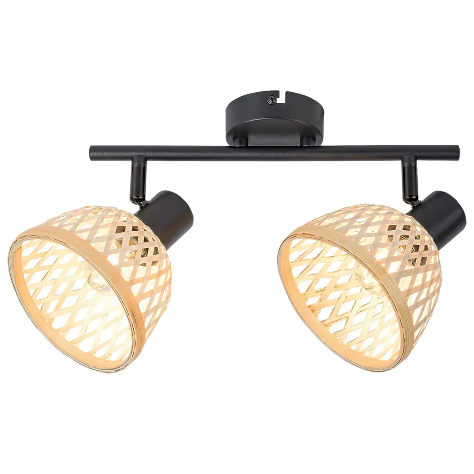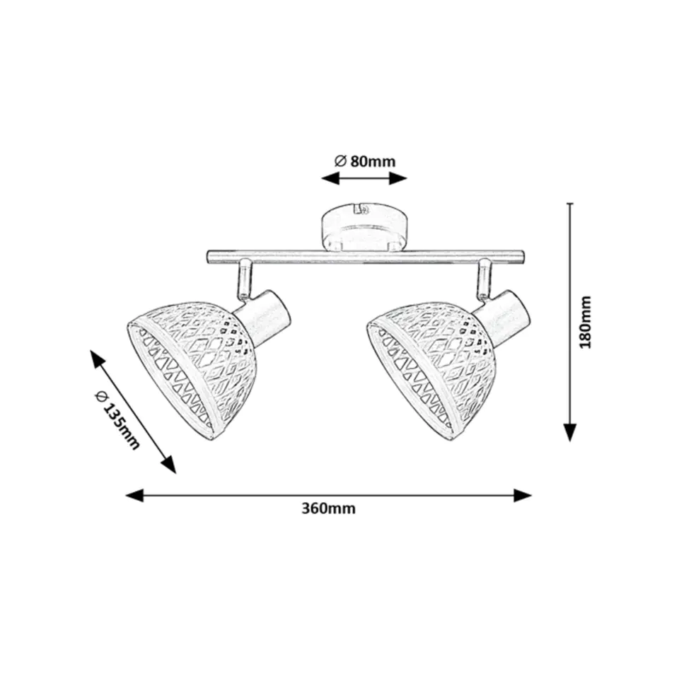 Wykonany w stylu industrialnym reflektor Rattan z dwoma żarówkami, można polecić do różnych pomieszczeń w mieszkaniu: można go zamontować w salonie, jadalni, kuchni, a nawet w sypialni. Metalową oprawę w kolorze matowo czarnym uzupełnia klosz w kształcie parasola wykonany z naturalnego rattanu. Lampa może być przymocowana do ściany za pomocą okrągłej, dekoracyjnej podstawy. Do Rattanu potrzebne są dwiema żarówki o mocy do 15W każda. Typ oprawki to E14. Zależnie od indywidualnych preferencji i potrzeb pomieszczenia, w którym zainstalujesz lampę, możesz wybrać ciepłe lub naturalne, białe źródło światła. Jeśli na przykład umieścisz ją w sypialni, zastosowanie żarówki z ciepłym, białym światłem pomoże Ci stworzyć przytulną, intymną atmosferę. Wymiary reflektora 2-żarówkowego Rattan są następujące: szerokość 360 mm, wysokość 160 mm, średnica każdego klosza wynosi 135 mm, odległość lampy od ściany wynosi 180 mm, średnica instalacji 80 mm. Prezentowany model jest sprzedawany bez żarówki.