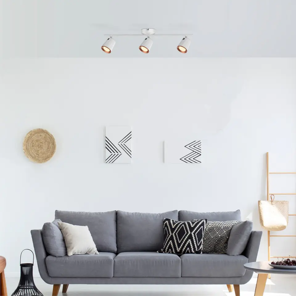 Potrójny reflektor Solange charakteryzuje się nowoczesnym, smukłym kształtem i prostym wyglądem. Metalowa oprawa tego oświetlenia na ścianę o biało-złotej kombinacji kolorystycznej uzupełniona została prostymi cylindrycznymi kloszami metalowymi. Dzięki regulowanym lampom możesz dowolnie kierować źródła światła. Reflektor Solange emitujący ciepłe białe światło świetnie wygląda w wielu wnętrzach: można go zamontować w nowoczesnym lub tradycyjnym salonie bądź przestronnym przedpokoju. Model ten posiada wbudowane źródła światła LED o łącznej mocy 18 W, natężeniu światła 1140 lumenów i żywotności 20 000 godzin. Temperatura barwowa źródła światła wynosi 3000 K. Ten potrójny reflektor ma 605 mm szerokości, a średnica jego okrągłej podstawy dekoracyjnej to 100 m. Solange jest objęty 5-letnią gwarancją.