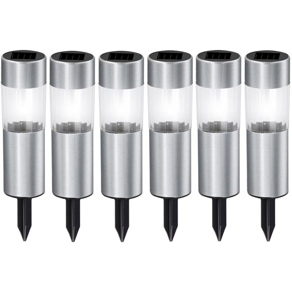 - w zestawie 6 szt. lamp wbijanych w podłożenaładowane na pełnym słońcu działąją od 6-8 godzinklasa szczelności IP44 zapewnia odporność na różne warunki pogodoweidealne do ogrodów, ścieżek, tarasów czy podjazdów dzięki łatwemu systemowi wbijaniawbudowany czujnik zmierzchu automatycznie aktywuje lampy po zapadnięciu ciemnościzapewniają estetyczny efekt świetlny, idealnie podkreślając ścieżki i przestrzeń ogrodu