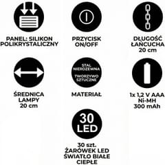 - kształt balonu tworzy efektowną i oryginalną dekorację świetlną30 diod LED z efektem płomienia nadaje ciepły, klimatyczny charakterwbudowany czujnik zmierzchu automatycznie aktywuje lampę po zmrokuodporność IP 44 umożliwia całoroczne użytkowanie na zewnątrzpanel polikrystaliczny skutecznie ładuje akumulator w ciągu dniaspecjalny łańcuch umożliwia bezpieczne i stabilne zawieszeniezasilanie solarne pozwala działać bez prądu i instalacji