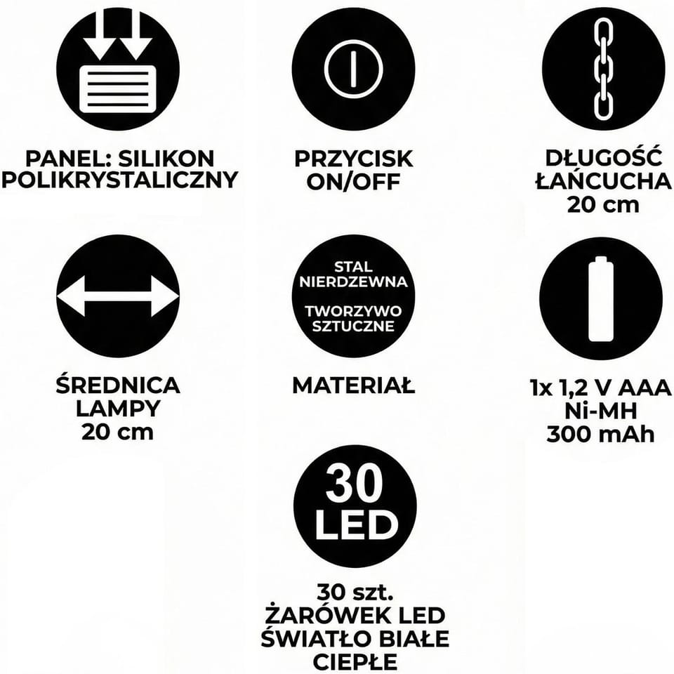 NA ŁAŃCUCHU - wytrzymały łańcuch stalowy o długości 20 cm pozwala bezpiecznie zawiesić lampę. Zapewnia stabilność i estetyczny wygląd. Idealny do pergoli, altany lub gałęzi.