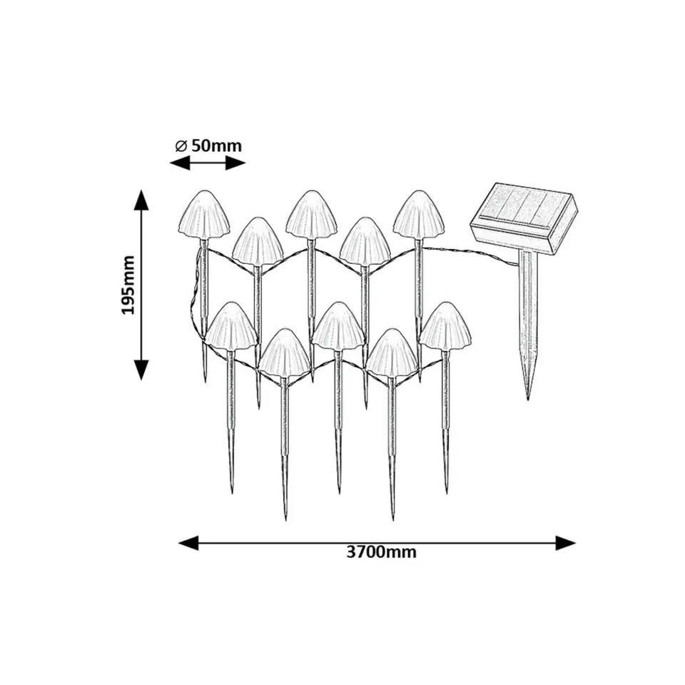 Cechy- Praktyczny wybór do oświetlenia terenów wokół domu- 10 opraw z białym kloszem w kształcie grzybów- Wbudowane źródła światła LED o mocy 2 W- Barwa światła: ciepła biała- Stopień ochrony: IP44- Czas pracy na akumuatorze: do 8 godzin
