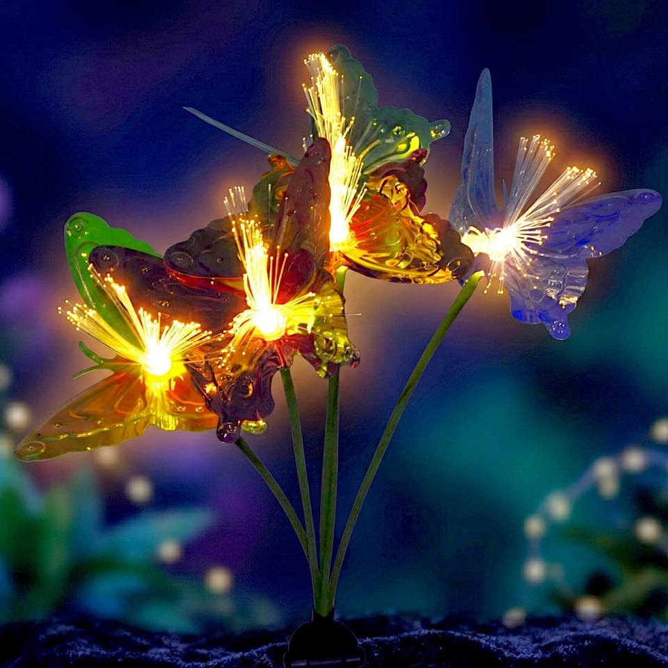 KOLOROWE MOTYLE - motyle wykonane w różnych barwach przyciągają uwagę w ciągu dnia. Po zmroku w połączeniu z ciepłym światłem tworzą dekoracyjny, wielokolorowy efekt wizualny. To wyjątkowy akcent w każdej aranżacji ogrodu.
