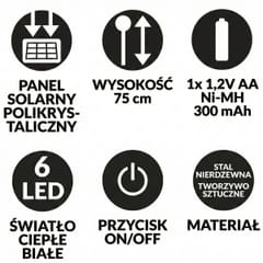 - forma trawy pozwala naturalnie wkomponować lampę w ogród6 ciepłych diod LED tworzy delikatne, nastrojowe światłoautomatyczne włączanie po zmroku zwiększa wygodę użytkowaniapanel polikrystaliczny skutecznie ładuje akumulator w ciągu dniawysokość 75 cm pięknie eksponuje światło wśród roślinzasilanie solarne oznacza brak kabli i brak rachunkówodporność na deszcz umożliwia całoroczne użytkowanie na zewnątrz