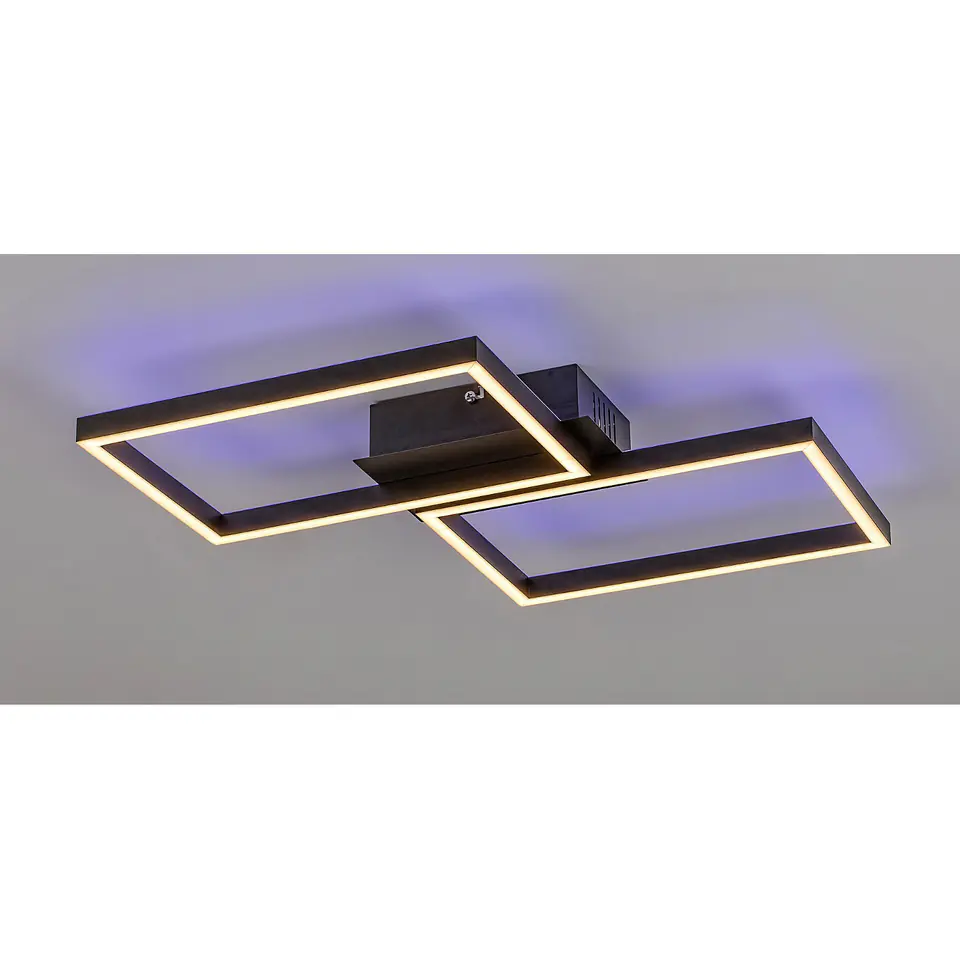 Specyfikacja- Kategoria produktu: lampy wewnętrzne- Typ: lampy sufitowe- Styl: nowoczesne- Pomieszczenie: pokój dzienny- Temperatura barwowa: można zmieniać- Strumień świetlny źródła światła: 2400 lm- Moc źródła światła: 40W- Technologia LED: tak- Stopień ochrony: IP20- Kolor lampy: czarny matowy- Materiał lampy: metal- Kolor klosza: biały- Materiał klosza: tworzywo sztuczne- Czas życia źródła światła: 30000 godzin- Klasa energetyczna źródła światła: G- Średnie zużycie energii: 40.0 (kwh/1000 Ah)- Stosowane napięcie: 230V, 50Hz- Odległość od sufitu: 65 mm- Szerokość: 460.0 mm- Długość: 410.0 mm- Barwa światła: 2700-6500 K- Pilot: tak- Zmiana barwy światła: tak- Ściemniacz: tak- RGB: tak- Funkcja pamięci: tak- Funkcja timera: tak- Światło nocne: tak- Klasa ochronności: II
