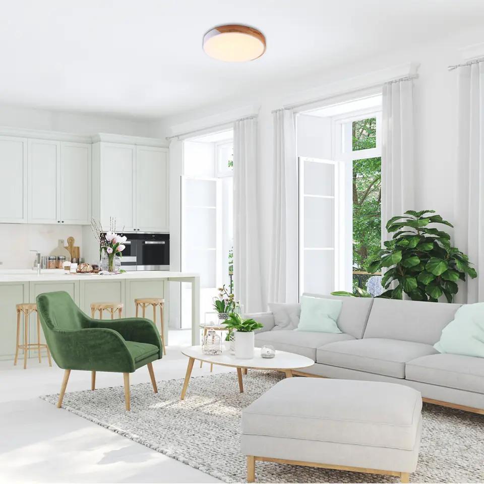 Cechy- Łącząca nowoczesny styl z naturalnością lampa sufitowa w stylu nordyckim- Ten matowo biały model, wykonany z metalu i drewna, doda trochę ciepła umeblowaniu Twojego salonu lub sypialni- Okrągłą oprawę uzupełnia biały plastikowy klosz- Model Maple zawiera wbudowane źródło światła LED o mocy 24W, strumieniu świetlnym 1760 lumenów i temperaturze barwowej 3000K- Ciepłe, białe światło- Żywotność to 30 000 godzin- Średnica tej niezwykle cienkiej lampy sufitowej wynosi 415 mm, odległość od sufitu to tylko 50 mm