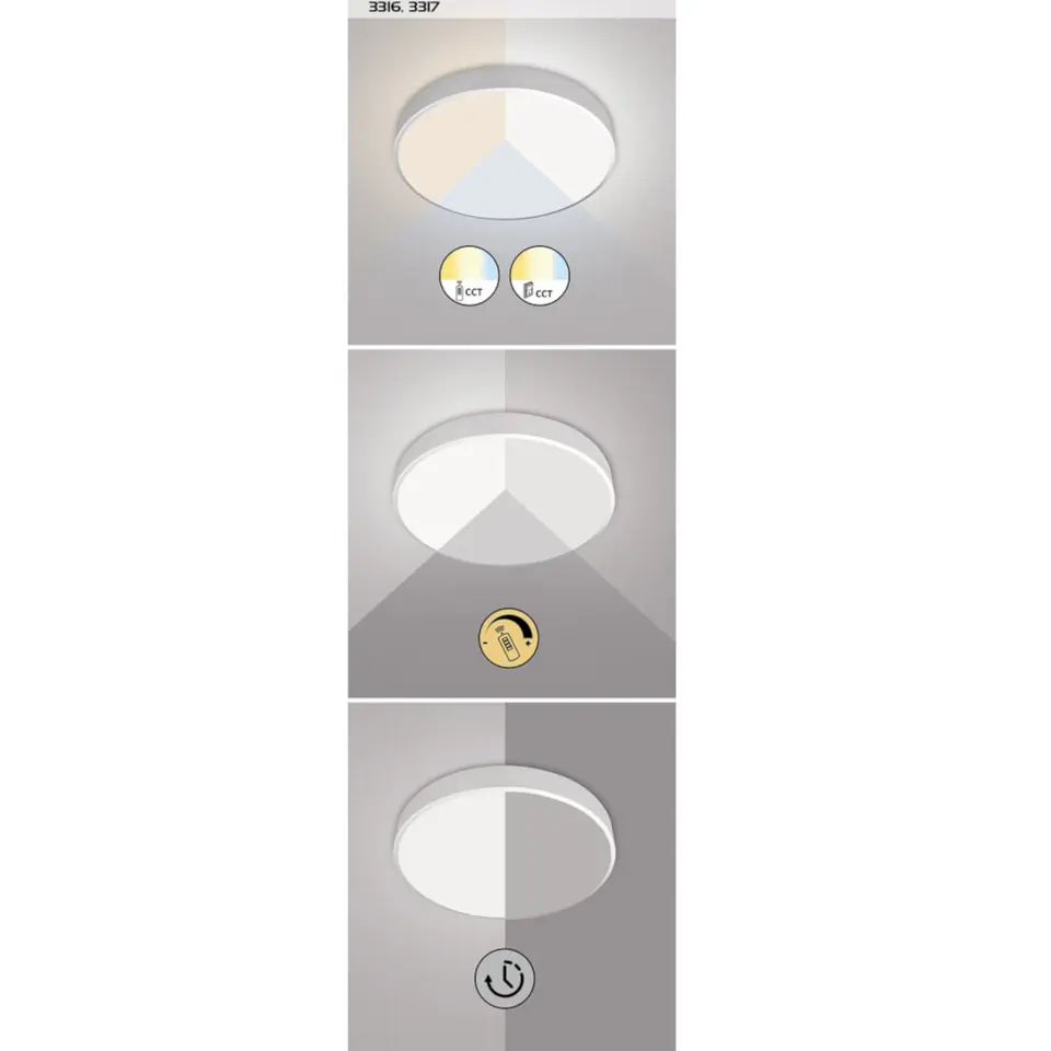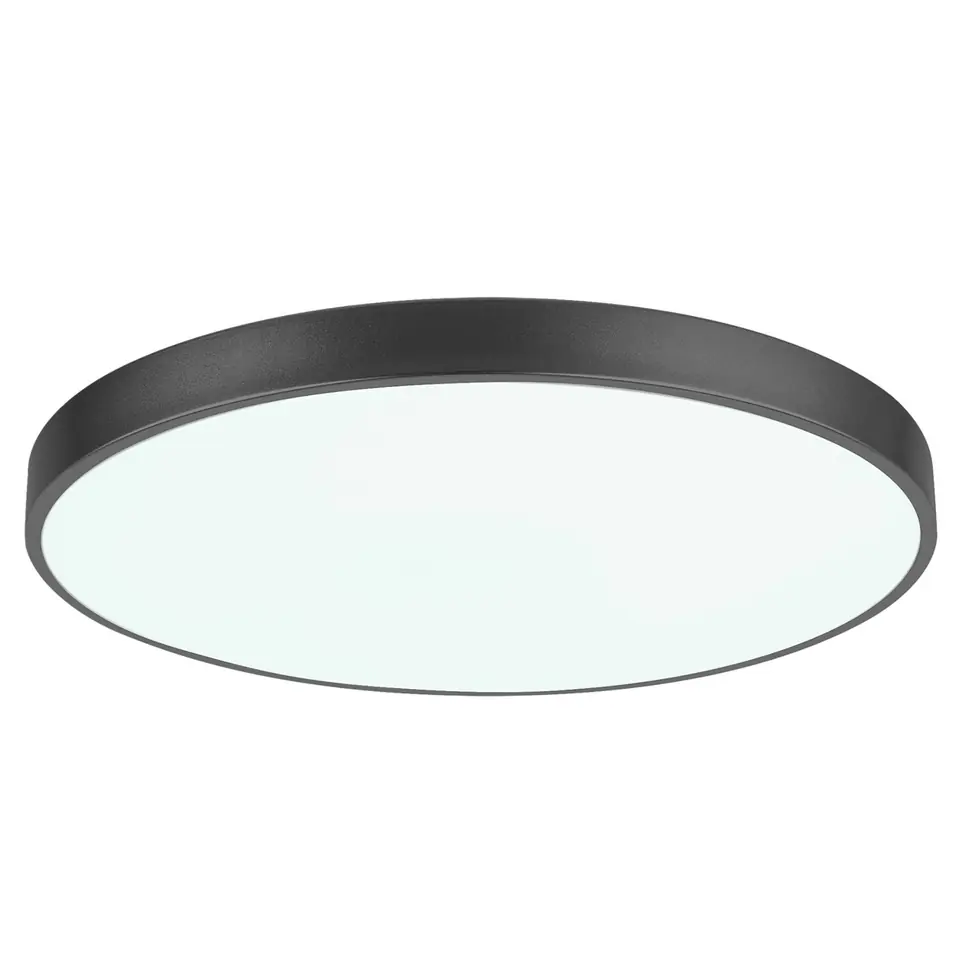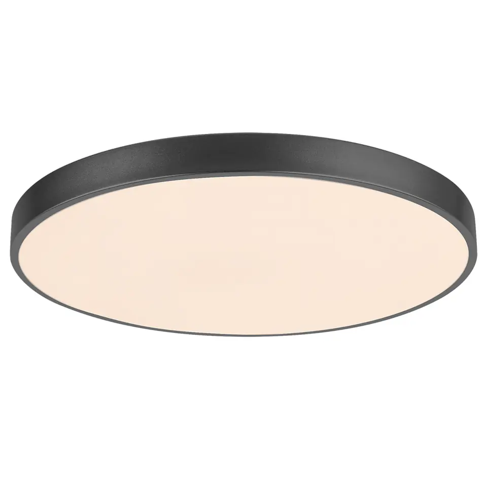 Okrągłą lampę sufitową Tesia polecamy tym, którzy chcą mieć w swoim nowoczesnym salonie lub sypialni inteligentną lampę o prostym, czystym wyglądzie, ale jednocześnie oferującą wiele dodatkowych funkcji. W modelu Tesia, matowo czarną, metalową oprawę uzupełnia biały plastikowy klosz. Lampa zawiera wbudowane źródło światła LED o mocy 60W, strumieniu świetlnym 5000 lumenów i temperaturze barwowej, którą można dowolnie regulować w zakresie 3000–6000K za pomocą przełącznika ściennego lub pilota. Imponująca żywotność żarówki wynosi aż 50 000 godzin! Lampa Tesia ma opcję przyciemniania, tzn. jej jasność można dowolnie zmieniać za pomocą pilota. Dodatkowo lampa posiada: funkcję pamięci, a także timer i funkcję oświetlenia nocnego. Średnica tej niezwykle cienkiej lampy sufitowej wynosi 600mm, odległość od sufitu to tylko 50mm.