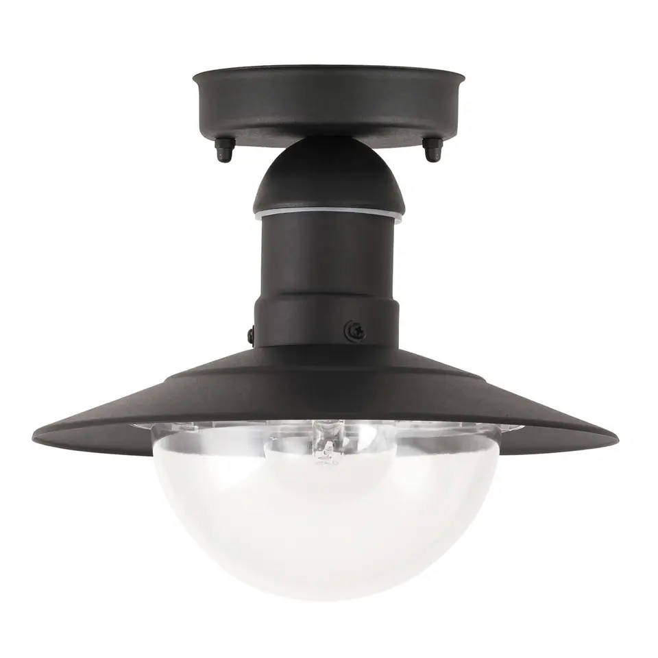 Specyfikacja- Typ: Zewnętrzna lampa sufitowa- Styl: Śródziemnomorskie- Pomieszczenie: taras- Stopień ochrony IP: IP44- Kolor lampy: czarny- Materiał lampy: metal- Kolor klosza: przeźroczysty- Materiał klosza: tworzywo sztuczne- Liczba gniazd: 1- Typ gniazda: E27- Specyfikacje oprawy oświetleniowej: E27 1x MAX 60W- Stosowane napięcie: 230V, 50Hz- Odległość od sufitu: 21,5 cm- Średnica: 24 cm- Waga netto: 1.1 kg- Klasa ochronności: I