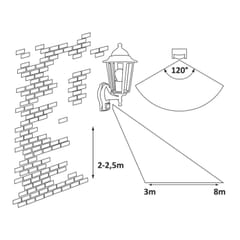 Specyfikacja- Materiał oprawy: Metal, szkło- Kolor: czarny- Wysokość: 36 cm- Szerokość: 21 cm- Odległość od ściany: 23 cm- Zasięg czujnika: 8 m , 120 stopni- Gwint: E27- Moc: 60W- Źródło światła w zestawie: brak- Stopień ochrony: IP43