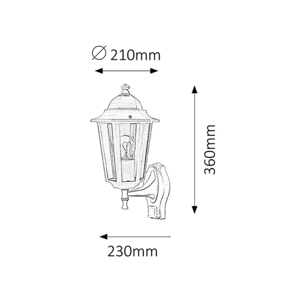 Cechy- Elegancki design- Wykonano z wysokiej jakości materiałów- Idealny na taras- Pasuje niemal do każdego wystroju- Wbudowany czujnik ruchu- Moc 60 W- Możliwość zastosowania żarówek LED o dowolnej mocyWymiary:- Wysokość: 36 cm- Odległość od ściany: 23 cm- Szerokość: 21 cm