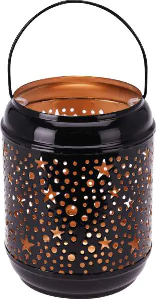Lampion świecznik metalowy czarny 13 cm Lampion ażurowy czarny wykonany jest z solidnego metalu, zaś w środku pokryty jest kolorem złotym, dzięki czemu po zapaleniu tealighta płomień prześwituje przez wzory ażurowe i delikatnie rozprasza się dookoła. Doskonale nadaje się do każdego wnętrza domowego, na balkon, taras jak i do ogrodu, nadając niepowtarzalną atmosferę. Specyfikacja techniczna: wymiary: 13 cm materiał: metal kolor: czarny. złoty