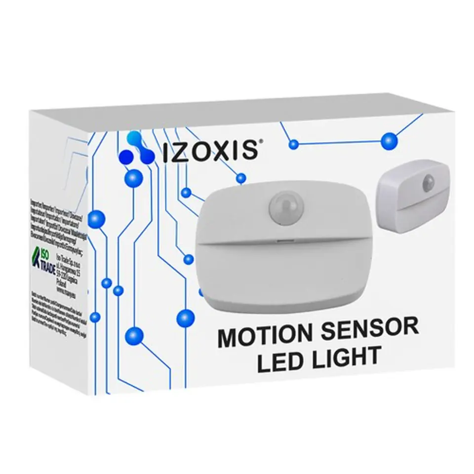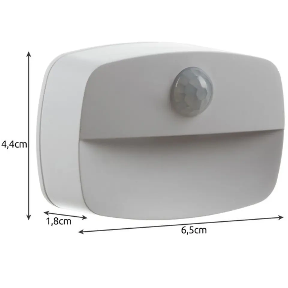 - SPECYFIKACJA - kolor: biały; materiał: ABS, pozostałe: PP + żelazo; czujnik ruchu PIR: tak; zasilanie na baterie: 3 x AAA (brak w zestawie); wymiary: 4,4 x 6,5 x 1,8 cm; waga: 0,023 kg; waga w opakowaniu: 0,037 kg.