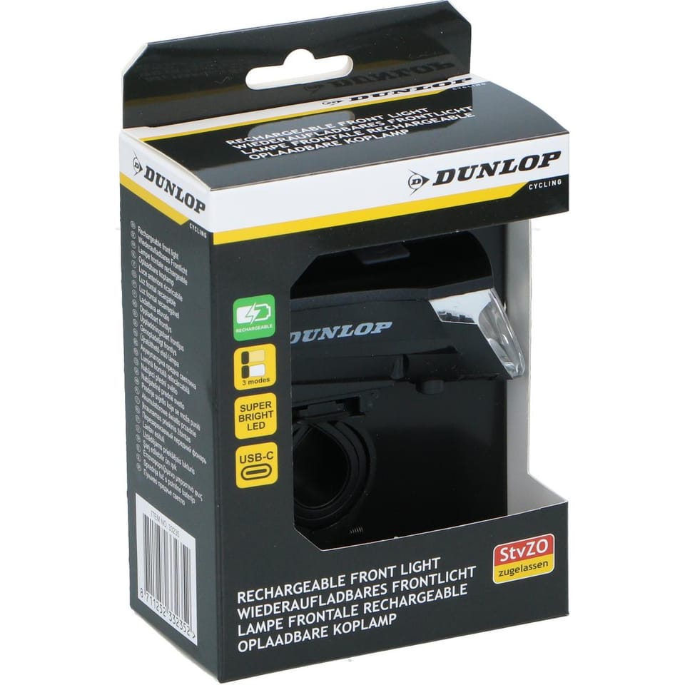 LAMPKA ROWEROWA PRZEDNIA LED USB - C CERTYFIKAT 3 TRYBY DUNLOP to praktyczne rozwiązanie dla każdego, kto ceni bezpieczeństwo i nowoczesną technologię. Dzięki USB-C szybko ją naładujesz, a trzy tryby świecenia umożliwią dopasowanie światła do warunków – od jazdy miejskiej po ciemne trasy.