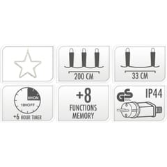 - 415 diod LED pięknie oświetli aż około 200 cm dowolnej powierzchnimogą być używane na zewnątrz i wewnątrz pomieszczeń posiadają ochronę IP 44działają znacznie dłużej od tradycyjnych lampek, nie nagrzewają się i zużywają mniej prądu 8 funkcji świecenia – od stałego światła po dynamiczne migotaniedługi przewód zasilający 500 cm – łatwy montaż w dowolnym miejscuwbudowany timer 6/18 h pozwoli wybrać godziny w jakich ma świecić kutynaposiadają certyfikat CE