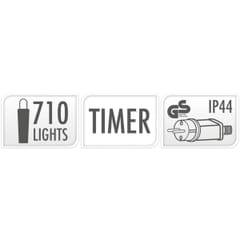 - 710 LED zapewnia efektowny blask na całej powierzchni choinkimogą być używane na zewnątrz i wewnątrz pomieszczeń posiadają ochronę IP 44działają znacznie dłużej od tradycyjnych lampek, nie nagrzewają się i zużywają mniej prądu 5 trybów świecenia oferuje różne opcje świetlne od migania po światło stałewbudowany timer 8/16 h pozwoli wybrać godziny w jakich lampki mają świecić2 cm odstępy zapewnią gęste, równomierne rozmieszczenie lampekposiadają certyfikat CE