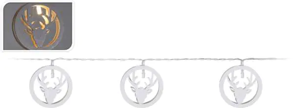 Lampki 10 LED motywem renifera światło ciepłe białe, odcinek świecący 2 m, do dekoracji wewnętrznych Lampki będą idealnie prezentować się na ścianie, wokół okien lub nad drzwiami, a także w przeróżnych aranżacjach np. wewnątrz lampionów. Lampki z motywem renifera w kolorze białym nadają się do zawieszenia w dowolnym miejscu w pomieszczeniu, ponieważ są na baterie.Dane techniczne: Kolor: biały, Zasilanie: baterie 2AA, Światło: ciepłe białe, Materiał: drewno, tworzywo sztuczne, Liczba lampek: 30, Rodzaj lampek: diody LED, Długość przewodu zasilającego: 30 cm, Długość całkowita ok.230 cm.