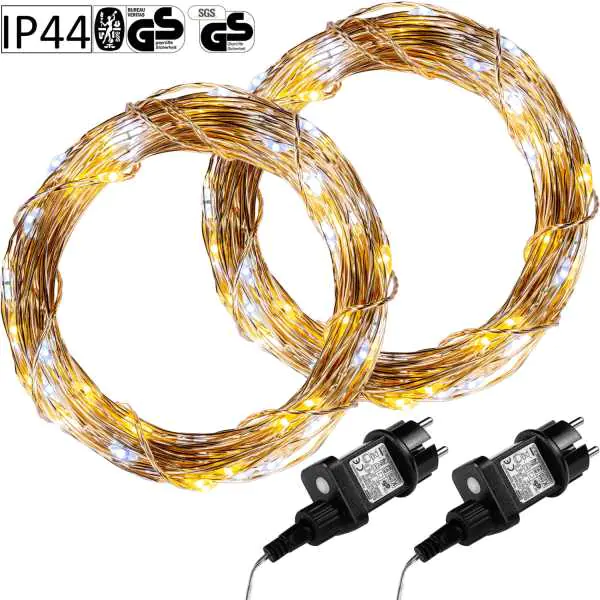 Lampki na druciku 200 LED VOLTRONIC 2 szt. ciepły/ zimny 2x20m z adapterem, na zewnątrz i do wewnątrz Łańcuch świetlny z drutu LED idealnie wpasuje się w kompozycję świąteczną, jak i efektywne oświetlenie do ogrodu. Można go użyć także do dekoracji choinki. W zestawie znajdują się 2 sztuki lampek. Na zewnątrz i do wewnątrz. Spcyfikacje: Drutowe bajkowe światła VOLTRONIC LED z TIMEREM (automatyczne 6h wł. / 18h wył.) do wewnątrz i na zewnątrz, Odcinek świecący: 20 m Zasilacz: 5 m Odległość między diodami: 10 cm Klasa ochrony: (IP44) Zasilanie: adapter, IP44 klasa ochrony z timerem- (automatyczne 6h wł. / 18h wył.), Długość kabla zasilającego: + 40 cm do komory zasilania, Kolor: ciepły/ zimny,