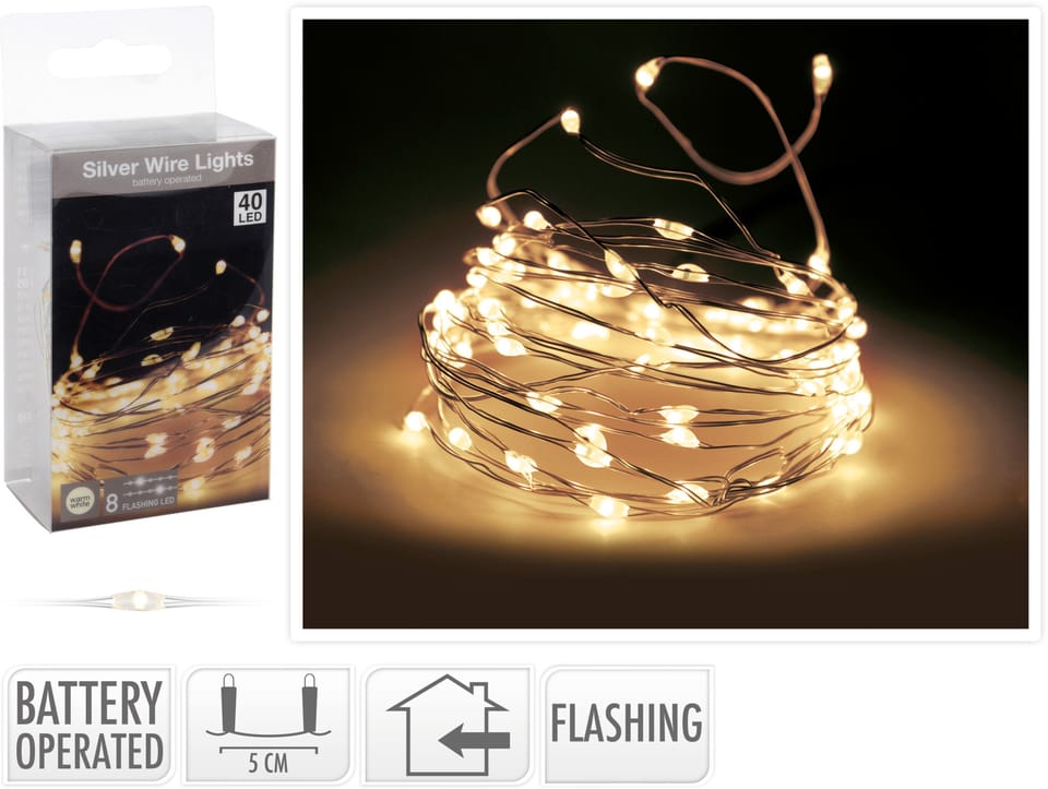 Lampki świąteczne , światełka na druciku 40 LED ciepła biel, migające Dekoracyjne lampki do każdego domu. Mogą służyć jako dekoracja do wazonu, lub świątecznego stroika. Dzięki zastosowaniu baterii lampki można wykorzystać w dowolnym miejscu, ale tylko w pomieszczeniach zamkniętych. Specyfikacja techniczna: Ilość lampek: 40 LED Kolor lampek: ciepła biel Lampki migające Odległość między lampkami 5cm Długość przewodu zasilającego: 10cm Zasilanie: na baterie 3x AA Brak baterii w zestawie