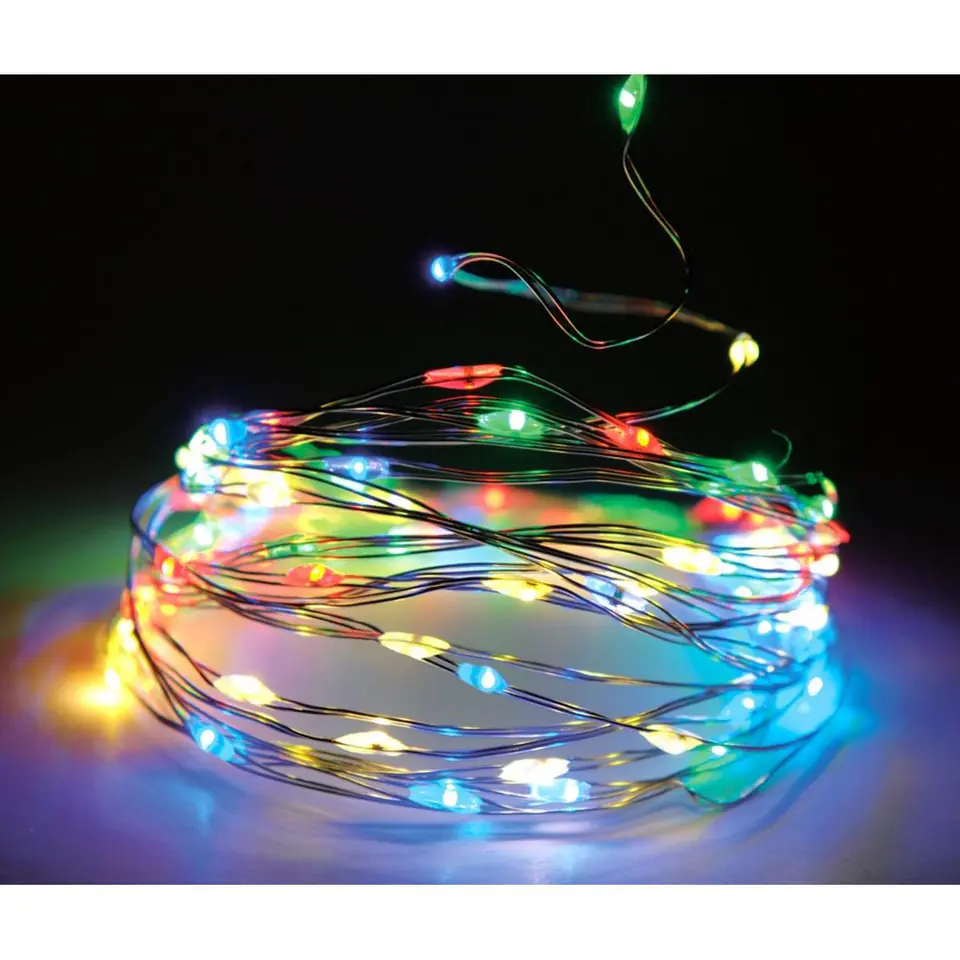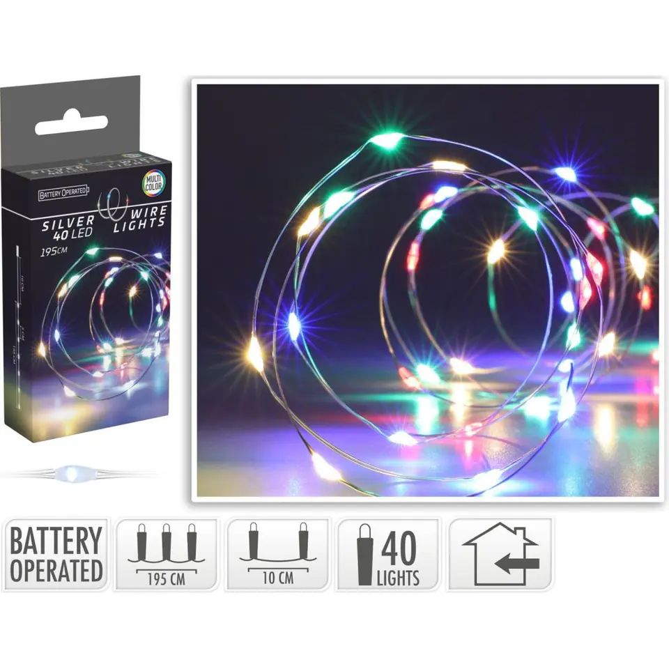 - 40 lampek LED wkomponowanych w cienki elastyczny srebrny drucikmultikolor podkreśli urok każdego przedmiotu i wnętrzanowoczesna technologia i baterie zapewnią długi czas świecenia lampekdługie na 195cm doskonale nadają się do dekoracji ślubnych, urodzinowych i dekoracji stołudiody LED nie pobierają dużej ilości energii, dzięki czemu jeden zestaw baterii starcza na długi czas świecenia.