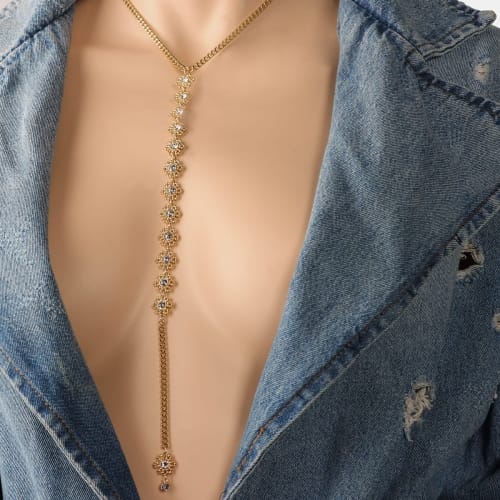 Naszyjnik z łańcuszkiem na dekolt i plecy. Można obracać i nosić dowolnie. Doskonały na specjalne okazje, biżuteria ślubna. Długość przód 21 cm, tył 4,5 cm