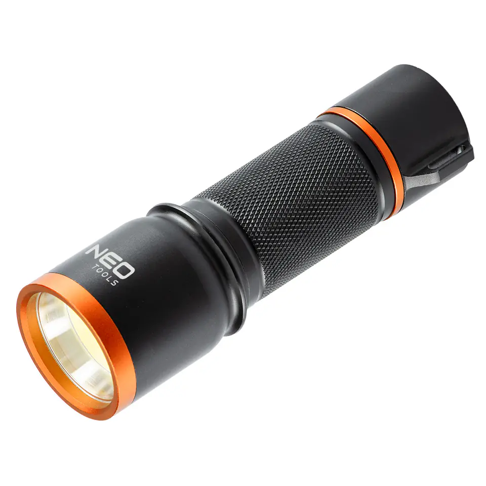 Latarka bateryjna Neo moc 3W, 200 lumenów, zasięg 200m, LED COB, IP20, zasilanie 3xAA (brak w zestawie), aluminiowy korpus, zaczep na opaskę ręczną, szeroka wiązka światła.