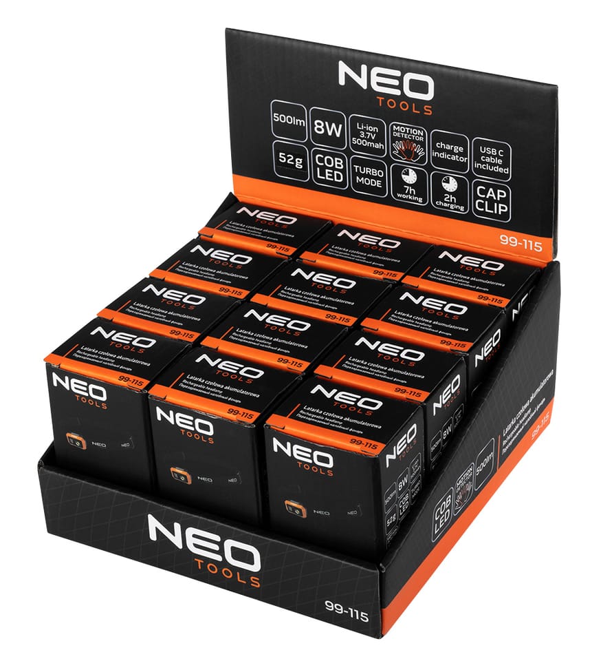 Latarka czołowa akumulatorowa 500 lm, USB C, COB LED, moc 8W, waga 180G, bateria Li-Po 3.7V 250mAh, funkcja włączenia czujnikiem ruchu, wskaźnik ładowania baterii, port ładowania USB C, przewód USB C w zestawie, regulowany gumowy pasek na głowe, klips na czapkę, czas ładowania 2h, czas pracy 100% mocy 3,5h, 50% mocy 7h, funkcje TURBO 100% (500)-100%(400Lm)-50%( 200Lm)-czerwone światło-zielone światło