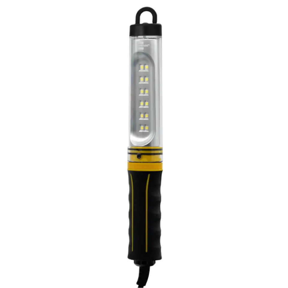Lampa robocza LED posiada obudowę z trwałego tworzywa sztucznego i gumowaną powierzchnie rączki dzięki czemu zapewnia idealne trzymanie w dłoni. Dodatkowo wyposażona jest w elementy umożliwiające zawieszenie takie jak: magnes czy hak z możliwością obrócenia w zakresie 360°. 5 m przewód o parametrach H07RB-F2x1.0 wraz z stopniem ochrony IP65 i IK07 powoduje że lampa idealnie sprawdzi się przy pracach przydomowych, warsztatowych jak i pracach w trudnych warunkach budowlanych. Dzięki możliwości przełączania natężenia światła między 100%-40%-10% możemy bez problemu dostosować intensywność źródła światła do potrzeb.